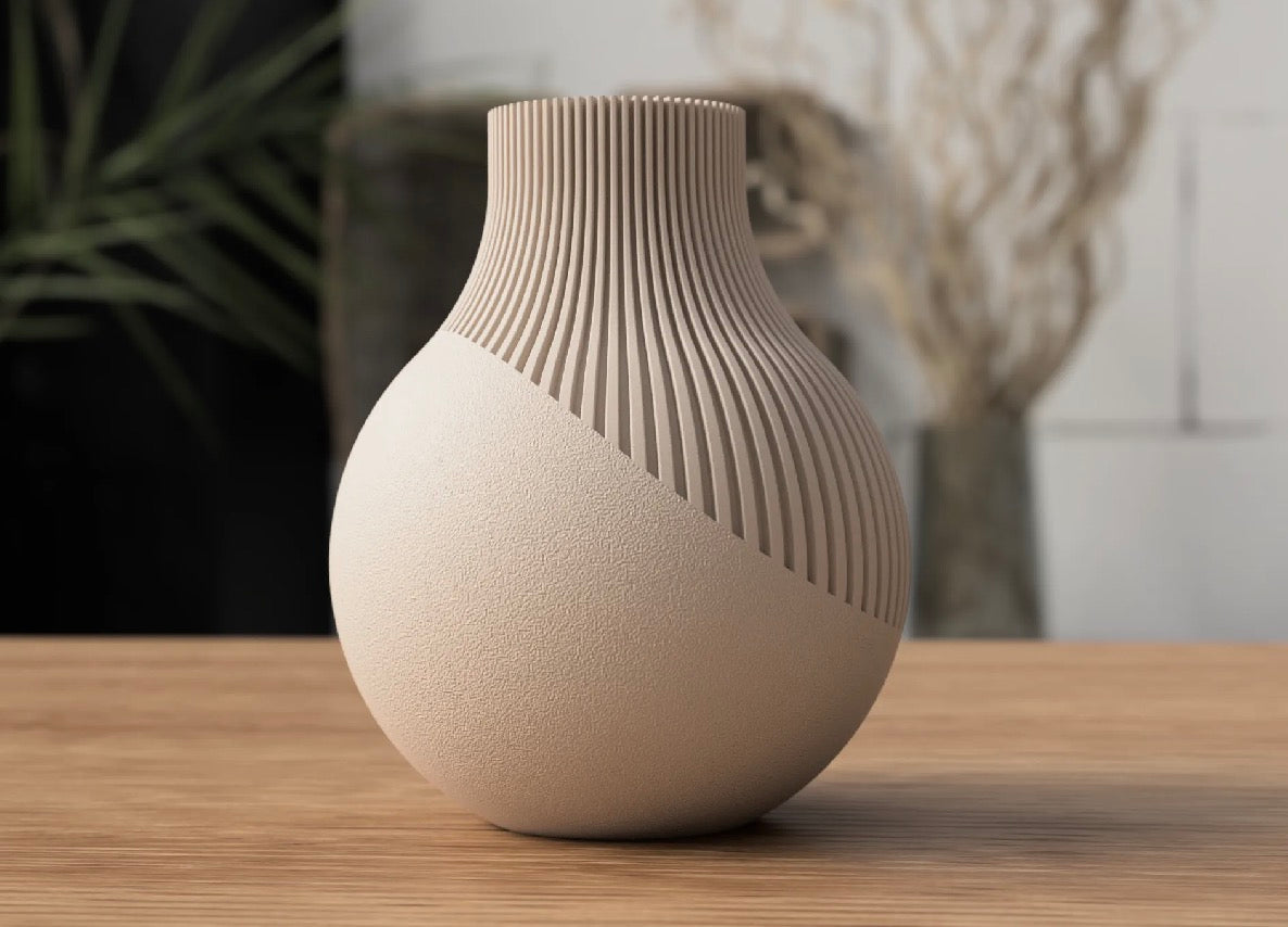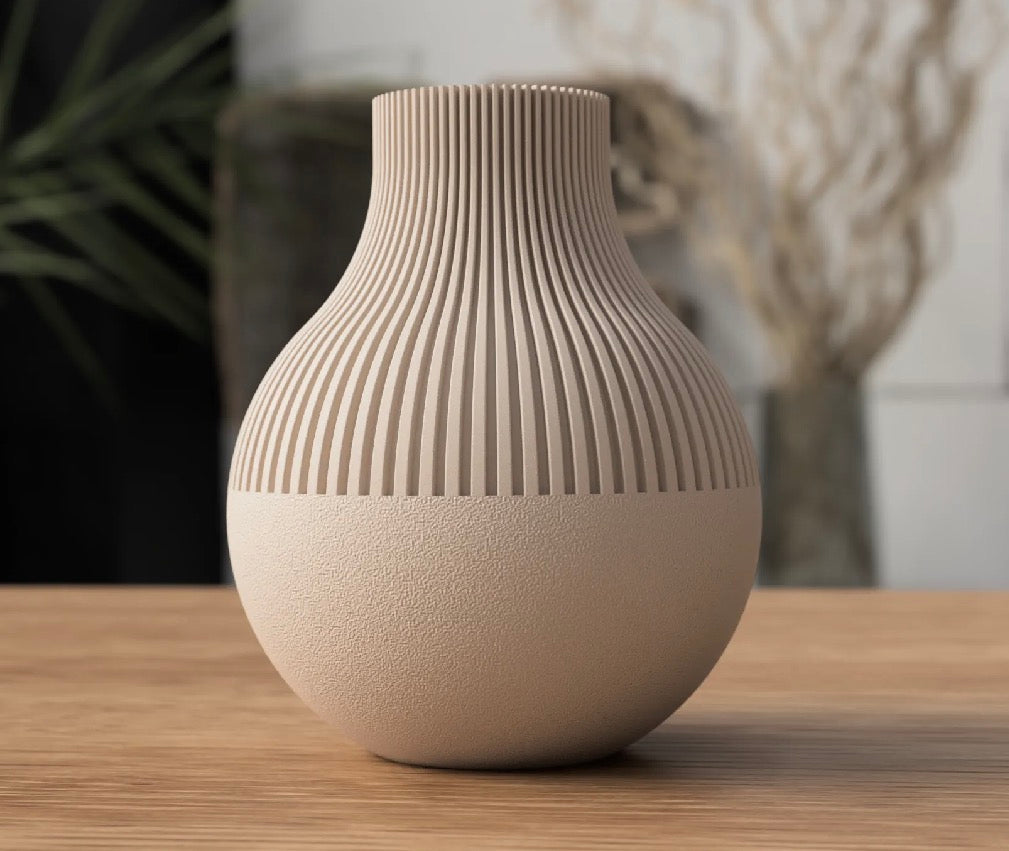 Moderne Serie japandi-inspirierter Neki-Vasen. Die nicht gerippten Bodenteile werden im Fuzzy-Modus gedruckt, um den Vasen eine moderne Textur zu verleihen. Die Vase ist 176 mm hoch und 150 mm breit.