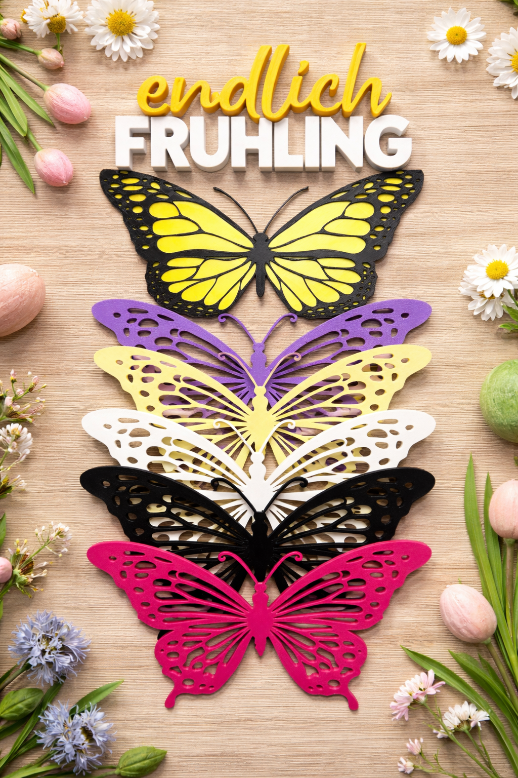 Bringe frische Frühlingsstimmung in dein Zuhause mit dieser stilvollen 3D-gedruckten Wand- oder Tischdekoration! Das Set besteht aus mehreren filigran gestalteten Schmetterlingen in harmonisch abgestimmten Farben sowie dem Schriftzug „endlich Frühling“, der das Design perfekt abrundet.