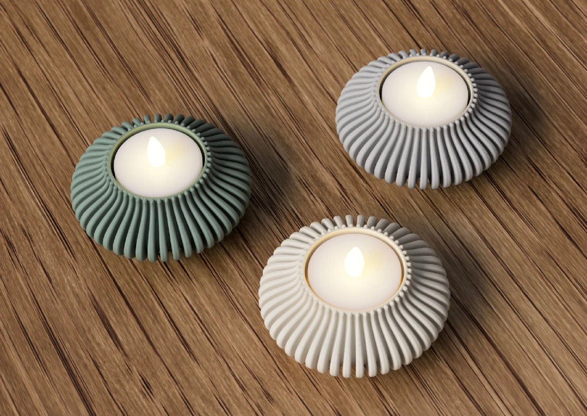 Sicherheit trifft auf skulpturales Design. Diese Teelichthalter wurden speziell für die Nutzung mit modernen LED-Teelichtern entwickelt. Durch die präzise 3D-Druck-Struktur entsteht ein sanftes Lichtspiel, das Ihre Räume in eine wohlige Atmosphäre taucht – ganz ohne Ruß, Hitze oder Brandgefahr.